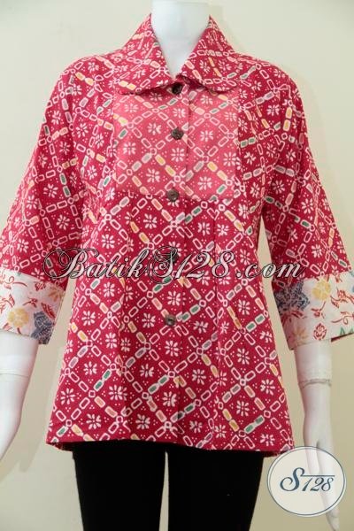 Agen Busana Batik Solo Online, Jual Baju Batik Wanita Masa Kini Model Blus Warna Merah Berpadu Motif Trend Terbaru [BLS1498C-XL,XXL]