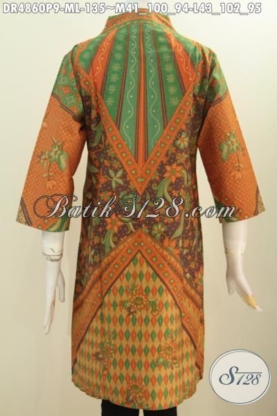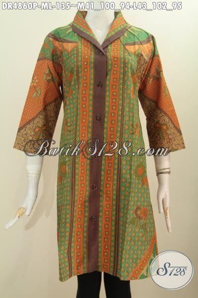 Aneka Pakaian Dress Batik Model Terkini, Busana Batik Elegan Motif Sinaran Berbahan Adem Proses Printing Model Kerah Langsung Cocok Buat Seragam Kerja [DR4860P-M , L]