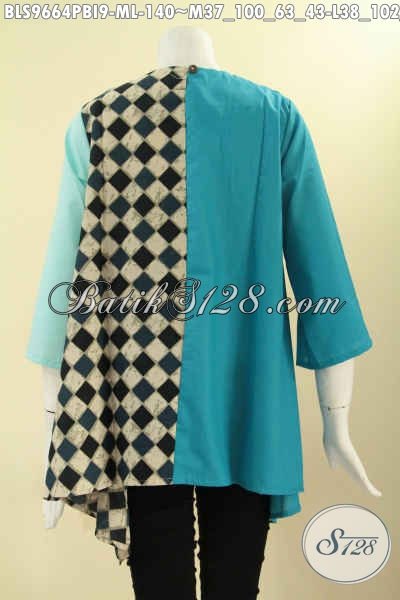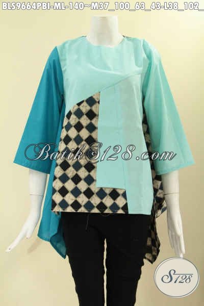 Atasan Batik Wanita Model Masa Kini Dengan Paduan Kain Polos Katun Ima Nan Modis, Busana Batik Kekinian Tanpa Krah Pakai Kancing Belakang Lengan 3/4, Cocok Buat Kerja Dan Ke Pesta [BLS9664PBI-M , L]