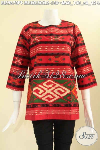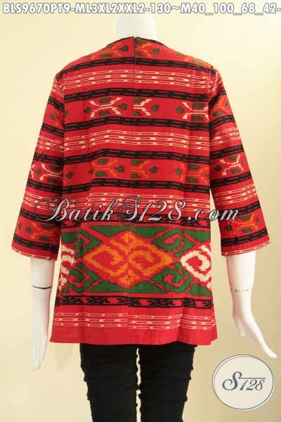 Atasan Batik Wanita Warna Merah Motif Tenun Untuk Seragam, Blouse Batik Istimewa Model Tanpa Krah Dengan Resleting Belakang Lengan 7/8, Bikin Penampilan Cantik Menawan [BLS9670PT-M , L , XL , XXL]