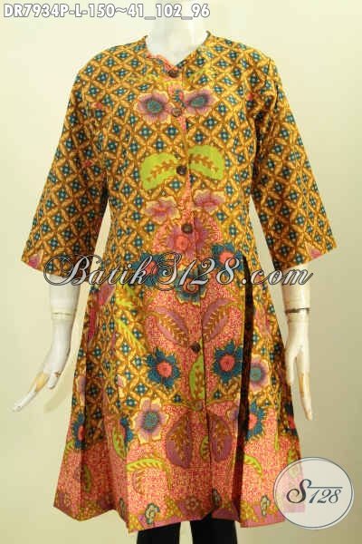Baju Atasan Batik Model Terusan Tanpa Krah, Dress Batik Kancing Depan Motif Bagus Proses Printing Hanya 100 Ribuan [DR7934P-L]