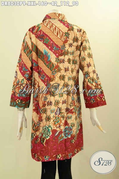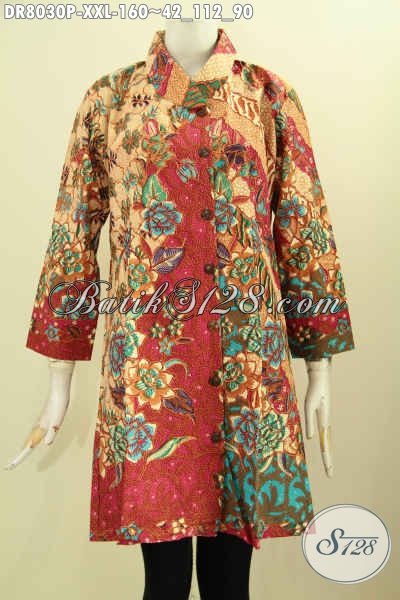 Baju Baitk Kerja Eksklusif Wanita Gemuk, Pakaian Batik Solo Istimewa Motif Mewah Proses Printing Desain Kerah Miring, Penampilan Makin Mempesona [DR8030P-XXL]