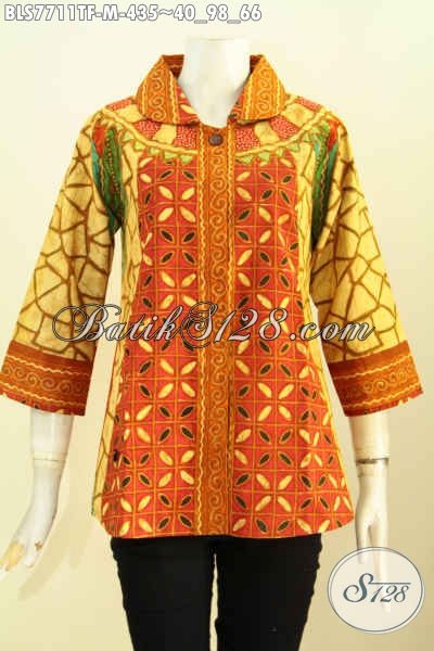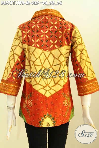 Baju Batik Atasan Perempuan Kantoran, Blus Batik Elegan Klasik Motif Sinaran Proses Tulis, Berbahan ADem Kwalitas Istimewa Harga 435K Daleman Full Tricot [BLS7711TF-M]