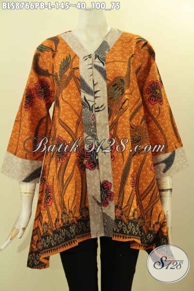 Baju Batik Atasan Wanita Kerja Model Kutubaru Lengan 7/8, Blouse Batik Solo Asli Motif Bagus Proses Printing Cabut Bahan Halus Nyaman Di Pakai [BLS8766PB-L]
