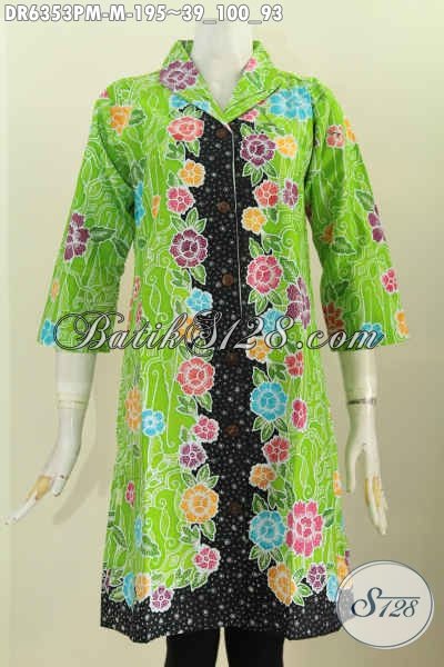 Baju Batik Bunga Bunga Kombinasi Warna Hijau Dan Hitam, Dress Batik Kerah Langsung Buatan Solo Bikin Wanita Makin Cantik [DR6353PM-M]