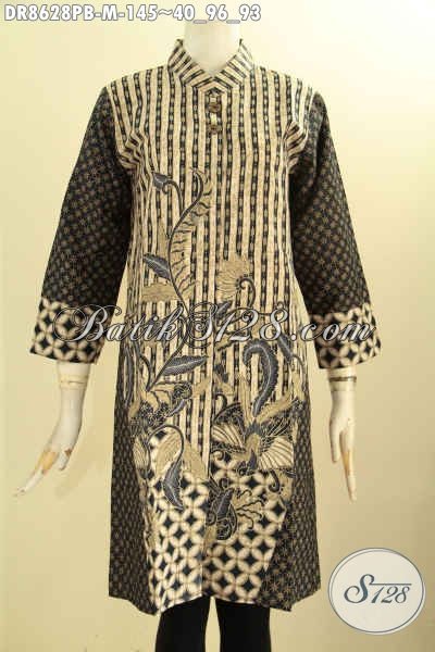 Baju Batik Cewek Kombinasi, Tunik Batik Dress Solo ELegan Motif Klasik Bahan Adem Proses Printing Solo, Busana Batik Jawa Tengah Kerah Shanghai Lengan 7/8 Kancing, Cocok Buat Ngantor [DR8628PB-M]