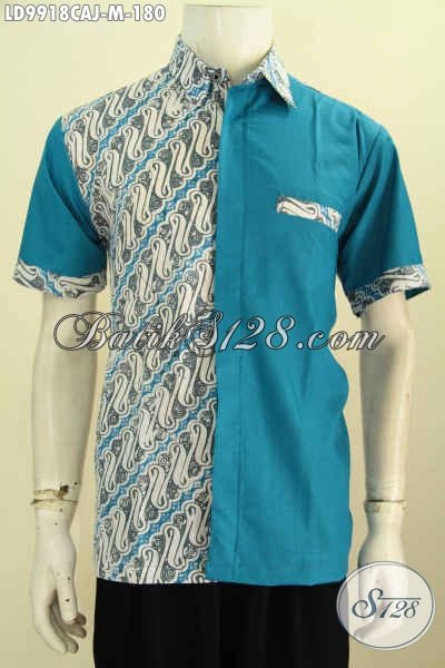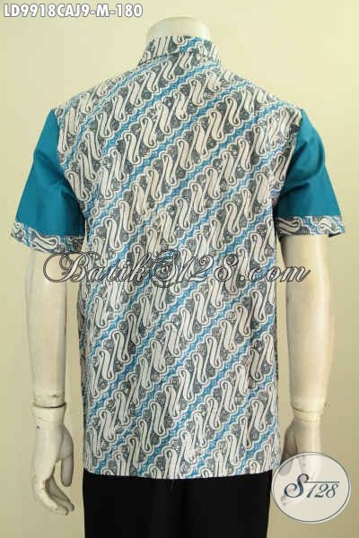 Baju Batik Cowok Warna Biru Motif Klasik Kombinasi Kain Polos, Hem Batik Keren Lengan Pendek Motif Klasik Cap Warna Alam Kombinasi Katun Jepang Bikin Penampilan Menawan [LD9918CAJ-M]