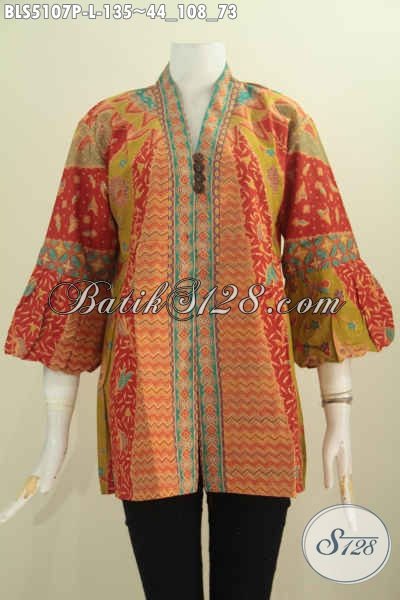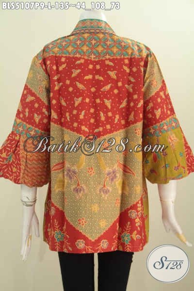 Baju Batik Dengan Nuansa Warna Merah, Pakaian Batik Klasik Elegan Proses Printing Desain Kerah Kartini Berpadu Lengan Balon Istimewa Buat Acara Formal [BLS5107P-L]
