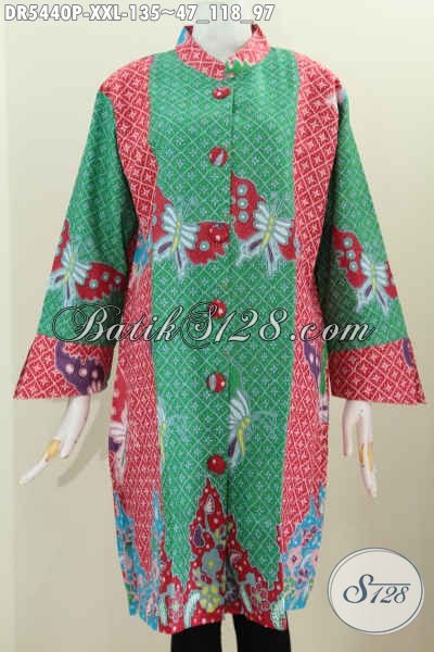 Baju Batik Dress Hijau Motif Kupu Ukuran XXL Di Jual Online, Busana Batik Kancing Besar Proses Printing Exclusive Buat Wanita Gemuk Terlihat Anggun Dan Berkharisma [DR5440P-XXL]