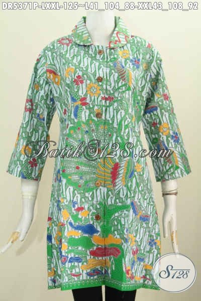 Baju Batik Dress Hijau Motif Terbaru, Pakaian Batik Seragam Kerja Wanita Karir Model Kerah Bulat Proses Printing Untuk Penampilan Lebih Stylish [DR5371P-L , XXL]
