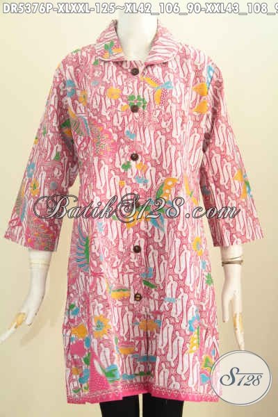 Baju Batik Dress Kerah Bulat Warna Pink, Busana Batik Halus Nan Istimewa Bahan Adem Yang Nyaman Di Pakai, Pakaian Batik Printing Dari Solo Tampil Gaya Dan Modis [DR5376P-XL , XXL]