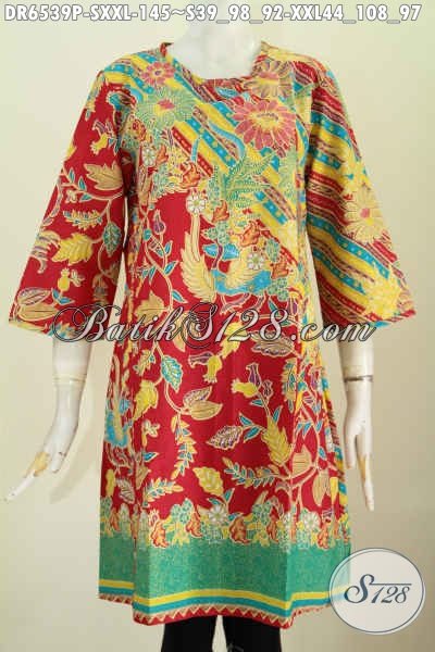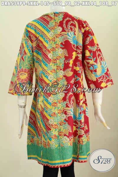 Baju Batik Dress Modern Desain Tanpa Krah, Baju Batik Trendy Pake Resleting Belakang Warna Bagus Proses Printing Hanya 145K [DR6539P-S , XXL]