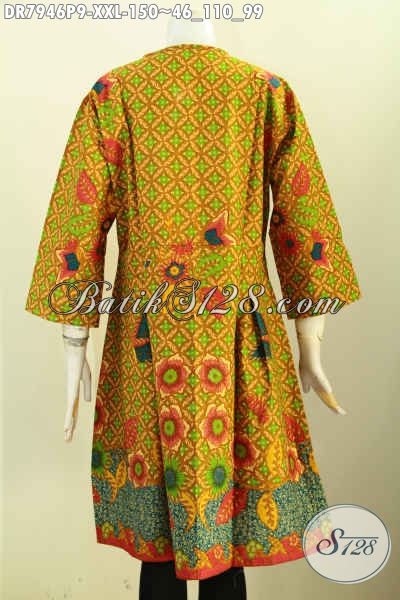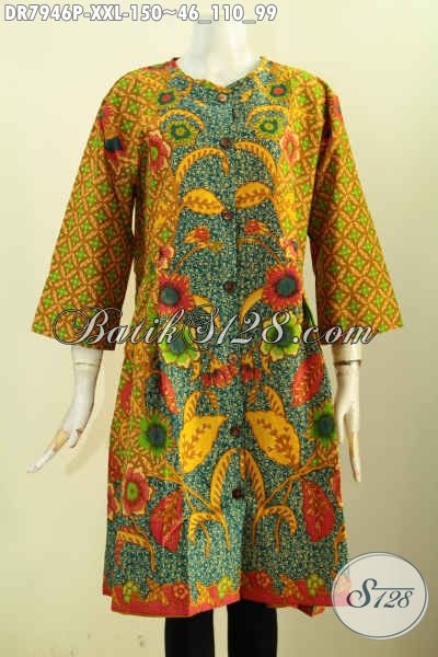 Baju Batik Dress Motif Bunga, Busana Batik Terusan Big Size Tanpa Krah Pakai Kancing Depan Proses Printing, Di Jual Online 150K Buat Wanita Gemuk [DR7946P-XXL]