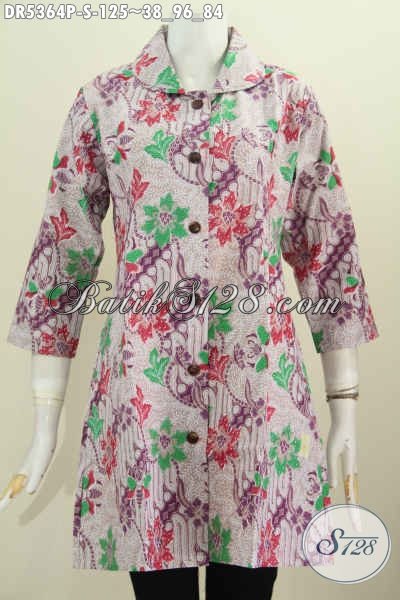 Baju Batik Dress Motif Bunga Desain Kerah Bulat, Busana Batik Kerja Proses Printing Buatan Solo Tampil Modis Dan Keren [DR5364P-S]