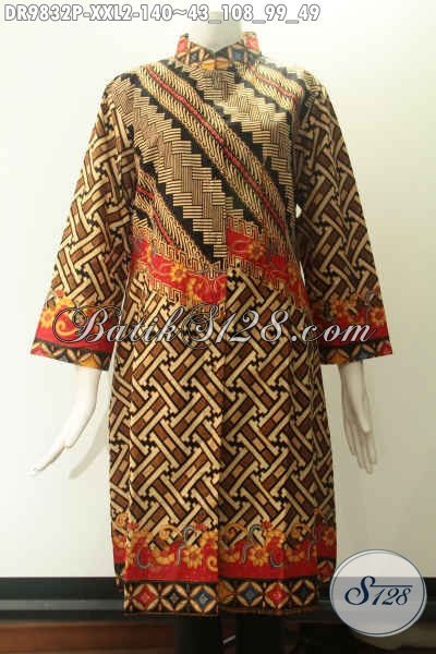 Baju Batik Dress Wanita Gemuk Big Size XXL, Berbahan Halus Motif Tren Masa Kini Kwalitas Istimewa Harga Murah, Model Kerah Shangahi Kancing Depan Sampai Bawah Lengan 7/8 [DR9832P-XXL]