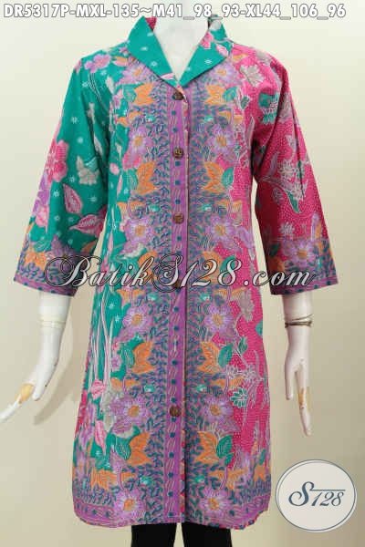 Baju Batik Dual Warna, Pakaian Batik Dress Kerah Langsung Desain Mewah Berbahan Halus Proses Printing Motif Terkini, Pas Buat Kerja Dan Pesta [DR5317P-XL]