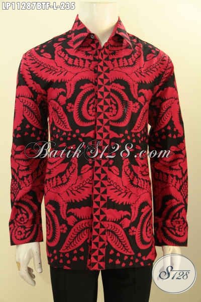 Baju Batik Hem Monokrom Merah Hitam, Kemeja Batik Elegan Lengan Panjang Full Furing Motif Bagus Proses Printing Cabut Hanya 200 Ribuan [LP11287BTF-L]