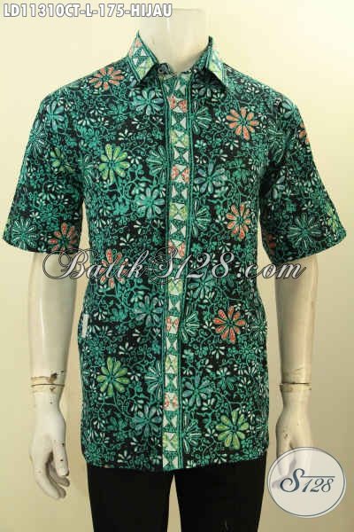 Baju Batik Hijau Pria Size L, Kemeja Batik Solo Asli Motif Bagus Tren Masa Kini Proses Cap Tulis, Busana Batik Lengan Pendek Cowok Cocok Untuk Kerja [LD11310CT-L]