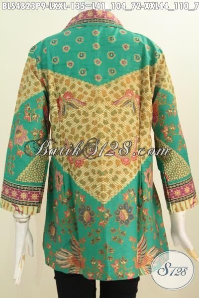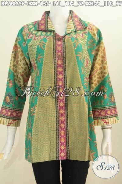 Baju Batik Jawa Untuk Wanita, Pakaian Blus Batik Motif Sinaran Proses Printing, Busana Batik Elegan Bahan Halus Model Kerah Kotak Lengan Tujuh Perdelapan [BLS4823P-XXL]