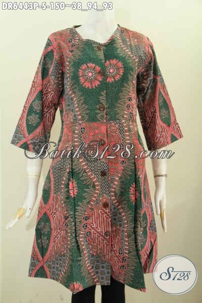 Baju Batik Kekinian, Dress Batik Wanita Muda Size S Bahan Halus Desain Tanpa Krah Pakai Kancing Depan [DR6443P-S]