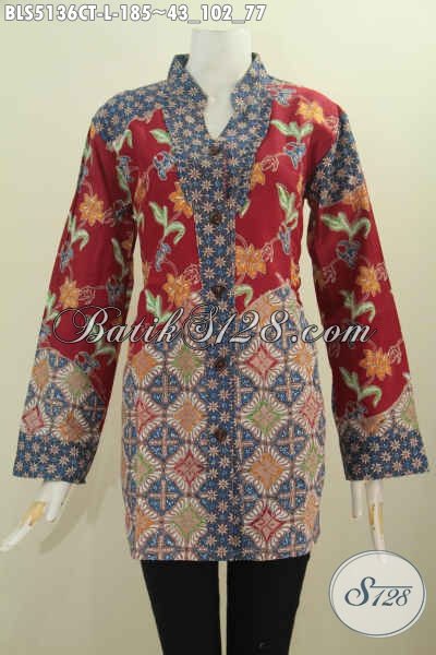 Baju Batik Keren Dua Motif, Pakaian Batik Wanita Desain Kerah Shanghai Kancing Depan Berbahan Halus Proses Cap Tulis Untuk Tampil Modern Dan Gaya [BLS5136CT-L]