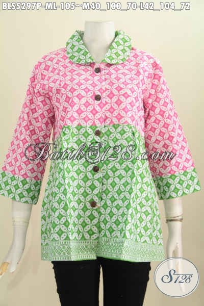 Baju Batik Keren Kombinasi Warna Pink Dan Hijau Muda, Blus Batik Kerah Bulat Motif Klasik Kawung Proses Printing Bahan Halus Untuk Penampilan Mekin Keren [BLS5297P-L]