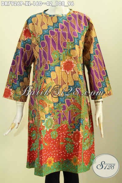 Baju Batik Keren Modis Tanpa Krah, Dress Batik Wanita Terkini Dengan Relseting Depan, Pakaian Batik Terusan Cewek Untuk Penampilan Lebih Anggun Dan Cantik [DR7926P-XL]