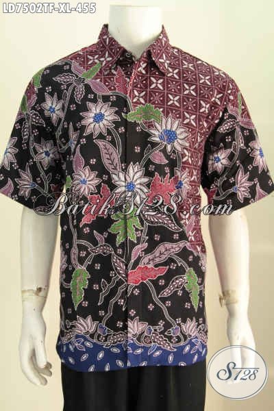 Baju Batik Keren Motif Bunga, Pakaian Batik Pria Dewasa Proses Tulis Asli Solo Model Lengan Pendek Pakai Furing [LD7502TF-XL]