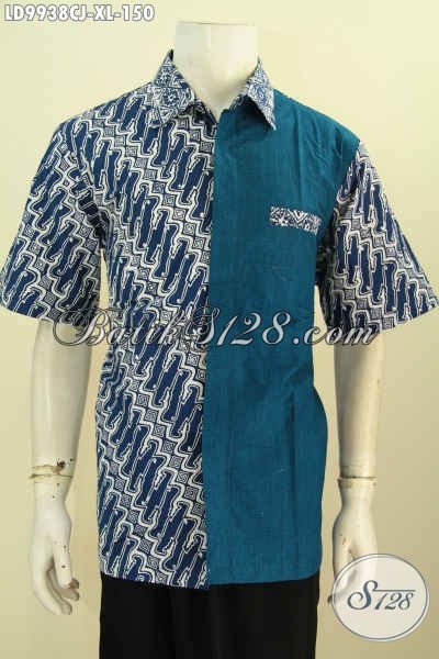 Baju Batik Kerja Lengan Pendek Desain Kekinian, Hem Batik Elegan Mewah Motif Klasik Kombinasi Kain Polos, Busana Batik Cap Kombinasi Katun Jepang Harga 100 Ribuan [LD9938CJ-XL]