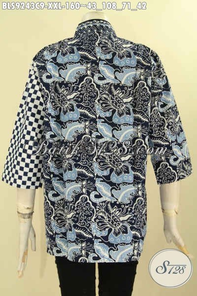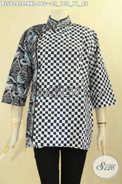 Baju Batik Kerja Wanita Gemuk Dual Motif Desain Kerah Shanghai Kombinasi Plesir Polos, Pilihan Tepat Tampil Cantik Dan Gaya [BLS9243C-XXL]