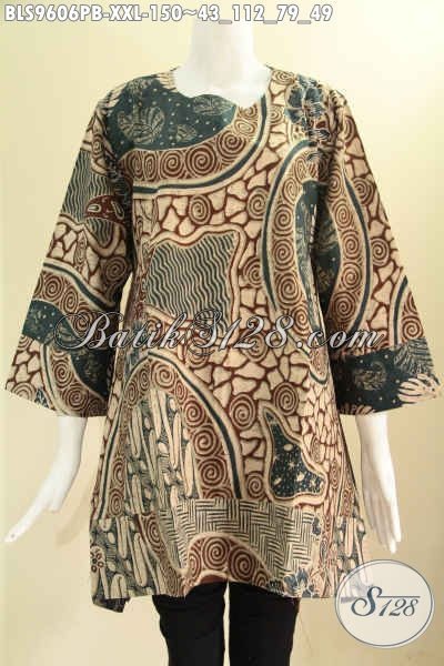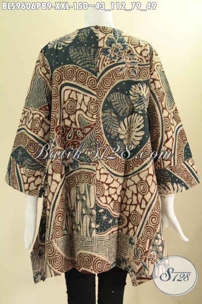 Baju Batik Kerja Wanita Karir Tren Masa Kini, Blouse Batik Model A Tanpa Krah Pakai Kancing 1 Belakang Lengan 7/8, Bahan Halus Motif Elegan Jenis Print Cabut [BLS9606PB-XXL]