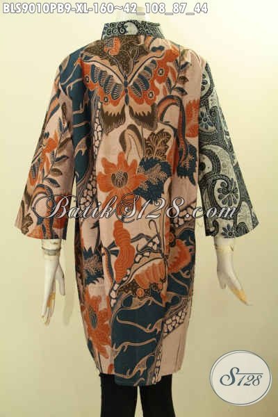 Baju Batik Kerja Wanita, Blouse Batik Solo Nan Elegan Dengan Kombinasi 2 Warna, Pakaian Batik Cewek Dual Motif Elegan Proses Printing Cabut Lengan 3/4, Tampil Modis Dan Berkelas [BLS9010PB-XL]