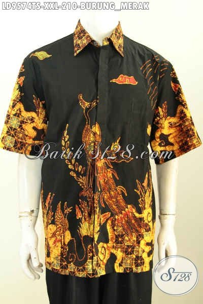Baju Batik Kwalitas Premium, Hem Batik Elegan Lengan Pendek Tulis Soga Motif Burung Merak, Spesial Untuk Lelaki Berbadan Gemuk [LD9574TS-XXL]