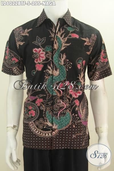 Baju Batik Lengan Pendek Pakai Furing, Busana Batik Istimewa Bahan Adem Dasar Hitam Elegan Motif Naga Proses Kombinasi Tulis Tampil Terlihat Gagah [LD6022BTF-S]