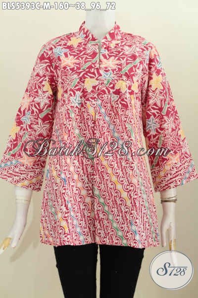 Baju Batik Merah Kombinasi Dua Motif, Batik Blus Kerah Shanghai Istimewa Untuk Kerja Dan Jalan-Jalan Tampil Stylish [BLS5393C-M]