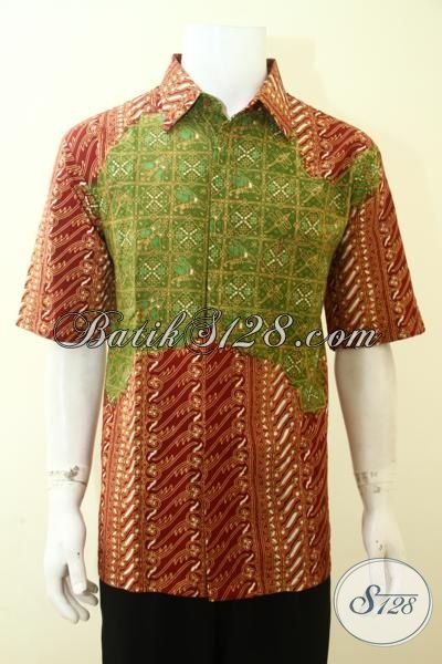 Baju Batik Merah Kombinasi Warna Hijau Pupus, Busana Batik Trend Mode 2015 Pria Macho Tampil Gagah [LD3590CT-XL]
