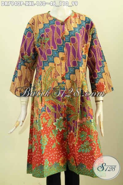Baju Batik Modern Klasik, Dress Batik Istimewa Bahan Halus Proses Printing Kancing Depan Tanpa Krah, Penampilan Lebih Istimewa [DR7940P-XXL]