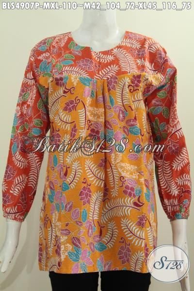 Baju Batik Modern Model Lengan Panjang, Busana Blus Wanita Dewasa Kwalitas Istimewa Motif Trendy Proses Printing Kombinasi Dua Warna Dan Pakai Karet Di Ujung Lengan [BLS4907P-M , XL]