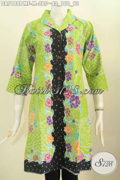 Baju Batik Modern Warna Cerah Kwalitas Bagus, Dress Batik Kerah Langsung Motif Bunga Kombinasi Tulis Lebih Mewah Dengan Daleman Full Tricot [DR5188PMF-M]