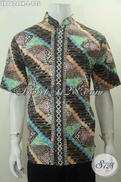 Baju Batik Motif Modern, Kemeja Batik Keren Lengan Pendek Model Kerah Shanghai Kantong Depan, Pakaian Batik Solo Proses Cap Lengan Pendek Size L Harga 130 Ribuan [LD6624CK-L]