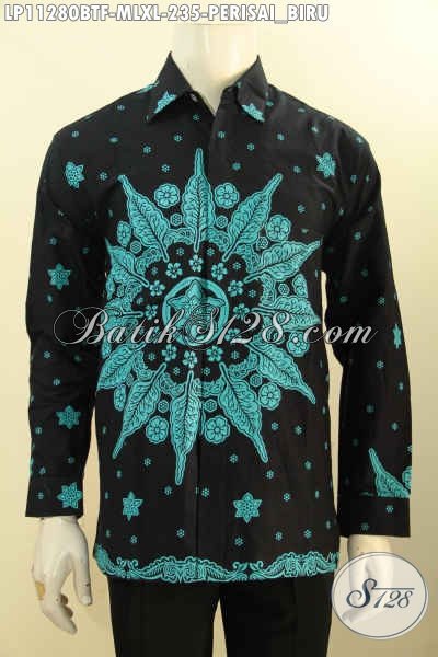 Baju Batik Motif Perisai Biru, Kemeja Batik Hitam Elegan Proses Printing Cabut Lengan Panjang Pakai Furing, Cocok Untuk Jalan-Jalan Dan Kondangan [LP11280BTF-M , L , XL]