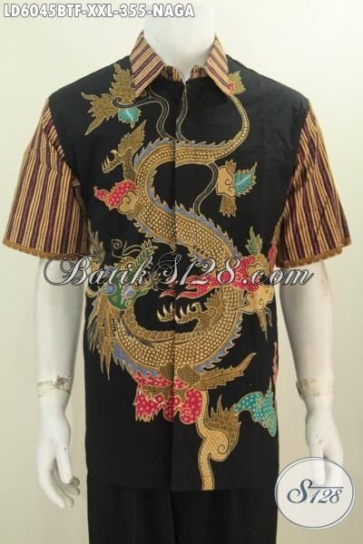 Baju Batik Premium Lengan Pendek Motif Naga Dasar Hitam, Produk Busana Batik Pria Gemuk Terkini Kombinasi Tulis Daleman Pakai Furing Ukuran Jumbo XXL [LD6045BTF-XXL]