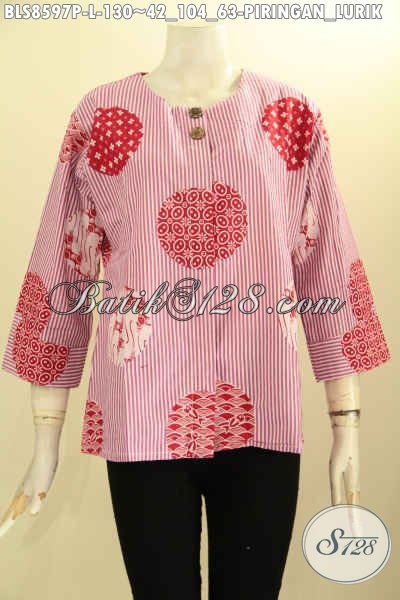 Baju Batik Trendy Untuk Wanita Tampil Cantik, Kemeja Batik Blouse Tanpa Krah Bahan Adem Motif Piringan Lurik Proses Printing Pakai Kancing Depan Hanya 100 Ribuan [BLS8597P-L]