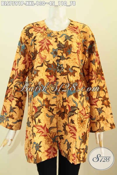 Baju Batik Wanita Kantor Badan Gemuk, Blus Tanpa Krah Modis Bahan Halus Motif Proses Printing Nan Elegan, Cocok Juga Buat Jalan-Jalan [BLS7591P-XXL]