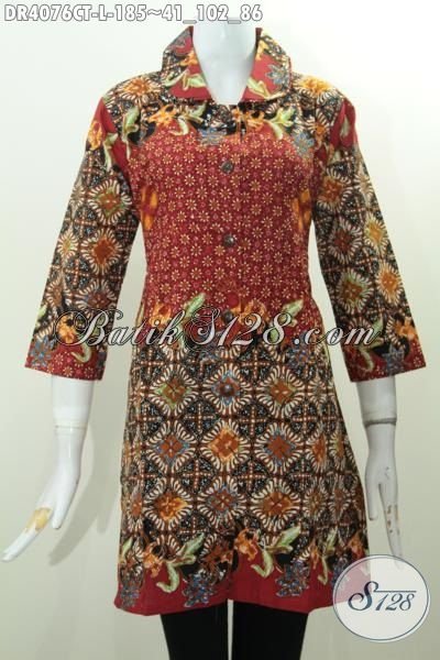 Baju Batik Wanita Karir Model Kerah Bulat, Busan Dress Batik Masa Kini Desain Formal Nan Mewah Berbahan Halus Proses Cap Tulis Membuat Perempuan Lebih Berkharisma [DR4076CT-L]
