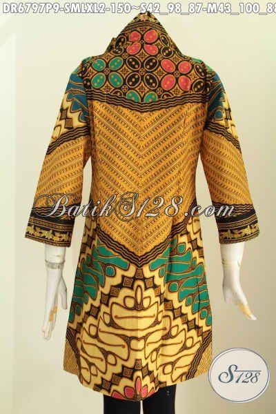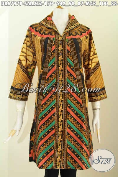 Baju Batik Wanita Kerja Kantoran, Busana Dress Batik Kerah V Motif Sinaran Klasik Proses Printing Asli Buatan Solo Indonesia [DR6797P-S , M , L , XL]