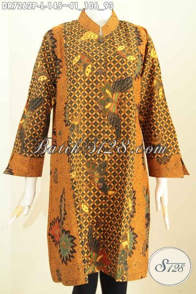 Baju Batik Wanita Modern, Dress Batik Elegan Dari Solo Model Kerah Shanghai Kombinasi 2 Warna Bahan Halus Nyaman Di Pakai Motif Printing 100 Ribuan [DR7262P-L]
