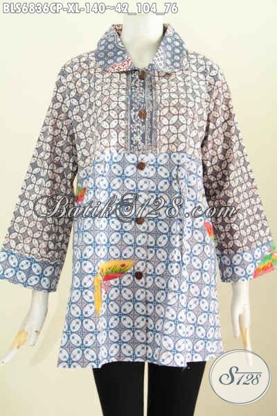 Baju Batik Wanita Simple, Blus Batik Modis 2 Warna Kerah Bulat Buatan Solo Asli Motif Proses Printing Harga Murmer [BLS6836CP-XL]