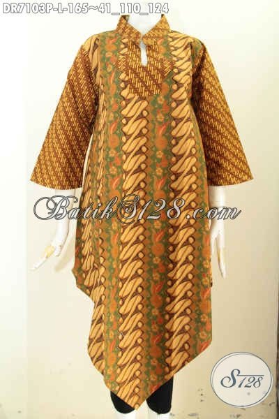 Baju Batik Wanita Warna Coklat, Dress Batik Model Terkini Bagian Bawah Lancip Untuk Kerja Dan Acara Resmi [DR7103P-L]