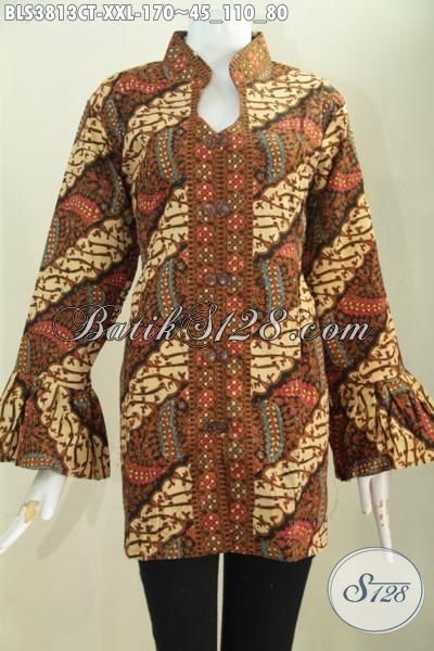 Baju Blus Batik Elegan Motif Klasik Proses Cap Tulis, Produk Busana Batik Wanita Gemuk Kerah Shanghai Kwalitas Halus Dengan Ujung Lengan Mekar Trend Masa Kini [BLS3813CT-XXL]